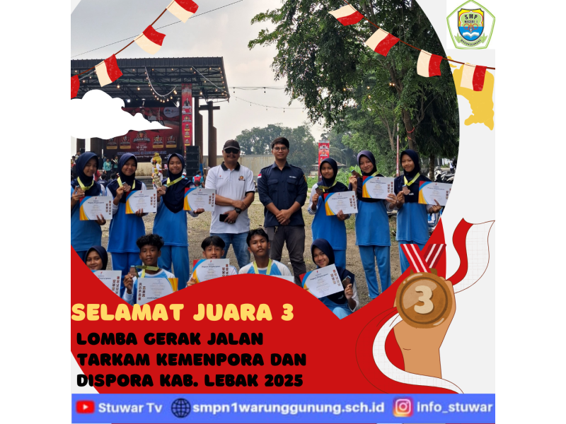 Selamat atas pencapaian dalam lomba Gerak Jalan TARKAM Kemenpora dan Dispora Kabupaten Lebak 2025 Juara 3. Seluruh Tim Paskibra SMPN 1 WARUNGGUNUNG terimakasih atas kado manis di awal bulan Oktober ini. ...