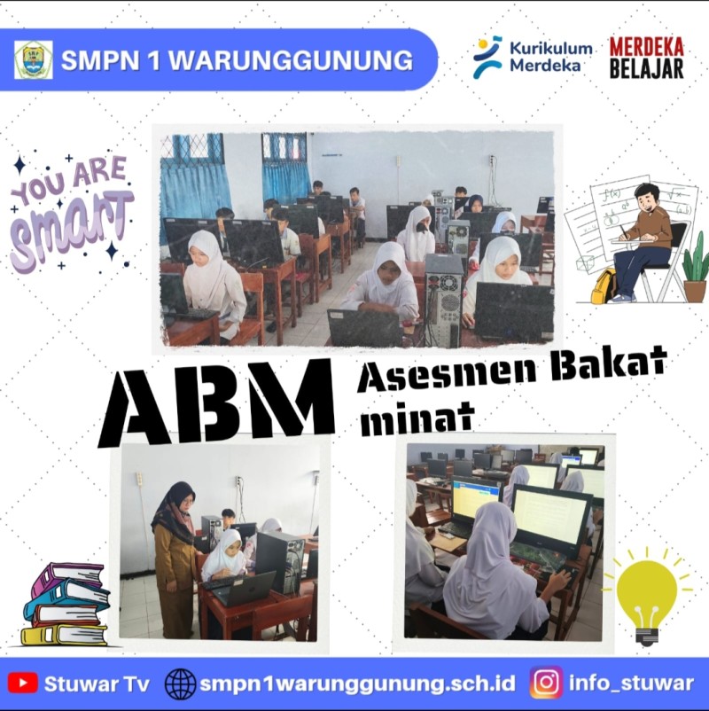 ABM adalah asesmen yang diselenggarakan oleh pusmendik untuk mengukur potensi atau memprediksi kemampuan siswa pada bidang bidang khusus ( verbal, kuantitatif, penalaran, spasial, mekanika, penggunaan bahasa, dan klerikal) serta untuk mengetahui minatnya berdasarkan ketertarikan pada jenis kegiatan atau pekerjaan. Kali pertama SMPN 1 Warunggunung melaksanakan ABM dengan jumlah peserta 96 siswa diambil dari kelas 9. Kegiatan ini sangat membantu siswa dalam minat dan bakat, ketertarikan pada pekerjaan. Kepala sekolah sangat mendukung ABM kali ini. Sekolah kami sudah menyiapkan dua Lab Komputer untuk kegiatan ABM ini, dengan hanya satu sesi dan dilaksanakan tiga hari lamanya, yaitu hari senin tanggal 19- 21 Februari 2024. Kegiatan ini dimulai dari simulasi sampai pada kegiatan inti ABM itu sendiri.