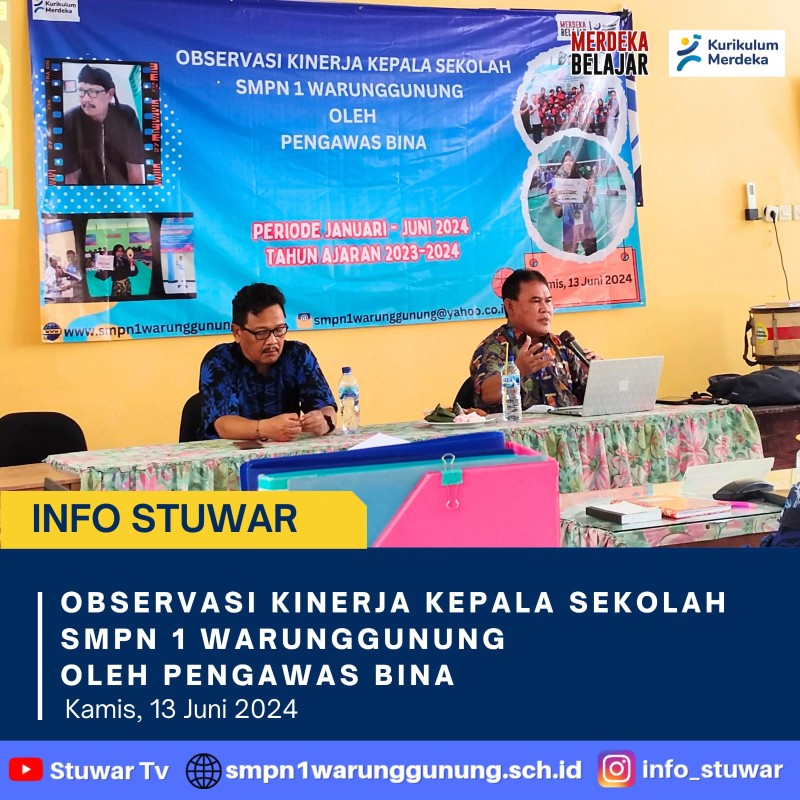 Observasi kinerja kepala sekolah smpn 1 warunggunung oleh pengawas periode Januari - Juni 2024 Tahun Ajaran 2023-2024 kegiatan ini memaparkan hasil observasi kepala sekolah kepada semua guru melalui observasi kinerja atau istilah lainnya supervisi. Kegiatan ini dimulai dari penjabaran visi dan misi, program sekolah, rapot pendidikan, perencanaan pembelajaran dan anggaran berbasis data, pengelolaan kurikulum, persiapan observasi, pelaksanaan observasi. Dengan adanya PMM diharapkan kita sebagai guru harus peduli dan lebih aware terhadap siswa. Kesimpulannya kegiatan observasi ini harus berdampak baik kepada siswa siswi.