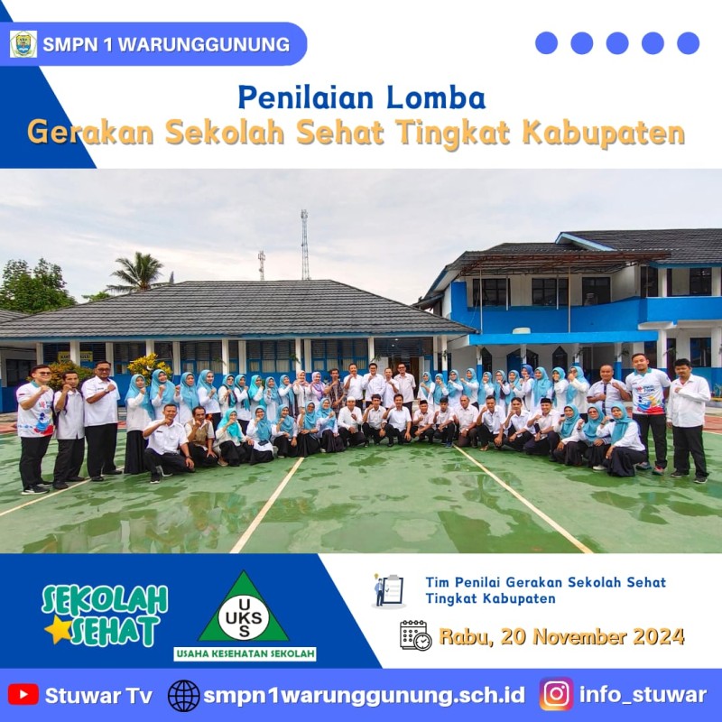 Lomba gerakan sekolah sehat stuwar menjadi salah satu peserta yang terpilih untuk mengikuti lomba gerakan sekolah sehat. Tim penilai dari dinas pendidikan hadir pukul 13.30 disambut dengan tarian selamat datang oleh siswa stuwar. Kepala sekolah mengawali kegiatan sekolah sehat dengan mempresentasikan tentang gerakan sekolah sehat di SMPN 1 Warunggunung. Kepala sekolah mulai memaparkan 5 fokus gerakan sekolah sehat, diantaranya sehat bergizi, sehat fisik, sehat imunisasi, sehat jiwa, sehat lingkungan. Lalu dilanjut dengan sambutan dari tim penilai. Hujan deras pun menemani kami dalam lomba sekolah sehat ini. Satu demi satu tim penilai bersama guru yang ditunjuk dalam bidangnya seperti ibu imas bidang UKS, Bapak Miftahudin dan Hazairin. Bidang kebugaran Jasmani ada pak Tri Fahmi. Dua jam lebih penilai berkeliling dilingkungan smpn 1 Warunggunung mulai dari UKS, lingkungan sekitar, kantin, dan WC menjadi sasaran tim penilai. Tim penilai dari dinas pendidikan. Tim UkS stuwar juga dibantu oleh Tim UKS dari puskesmas Warunggunung, pertanyaan demi pertanyaan dilontarkan oleh pihak penilai insyaallah semua jawaban sesuai dengan kondisi sekolah kita. Semoga mendapatkan hasil yang terbaik. Sekolah sehat idaman semua warga sekolah, harapan kami agar pembiasaan siswa dalam menjaga kebersihan lingkungan sekolah dapat terus membudaya agar pembiasaan ini menjadi hal positif bagi seluruh warga sekolah.